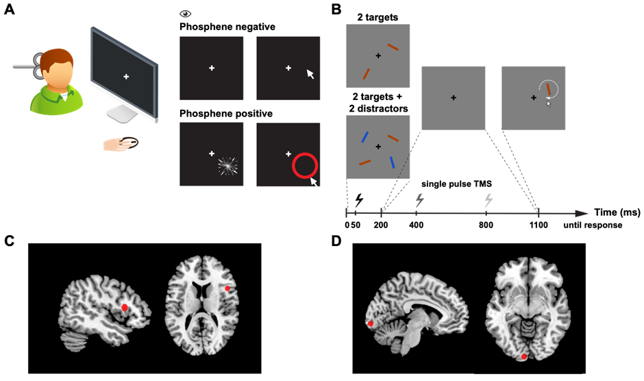 在本研究中,被试需要完成一项基于朝向的连续回忆任务(图3B),被试在实验前被告知某一个颜色的朝向刺激为目标刺激,而其它颜色的刺激则为干扰刺激。被试需要记住目标刺激的朝向,并在一段延迟期后用鼠标旋转被探测的刺激,使其与记忆编码过程中呈现的刺激朝向尽可能一致。被试反应与该刺激原始朝向的角度差异即为反应误差。在该任务的刺激呈现阶段(50ms)、早期延迟阶段(400ms)及晚期延迟阶段(800ms)的其中之一施加spTMS。使用磁共振T1结构像结合光幻视(图3A)的方法确定每个被试个体化的EVC坐标(图3D);IFJ则根据课题组在之前一项研究中所发现的与工作记忆精度表征相关的靶点坐标(图3C)。