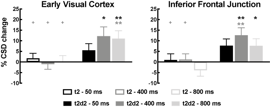 本研究首先计算了反应误差在圆上的标准差(CSD),以检验spTMS对于不同脑区及实验条件的影响。通过计算刺激条件相对于无刺激条件的行为学变化率发现,spTMS仅在干扰刺激出现的情况下(t2d2)对视觉工作记忆产生影响(图4)。贝叶斯T检验结果支持了无干扰刺激情况下(t2),spTMS对大部分实验条件不产生影响。