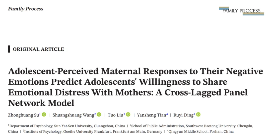 本研究发表在家庭研究领域家庭教育领域的知名期刊Family Process (JCR Q1, 中科院三区)(Su, Wang, et al., 2025)。中山大学心理学系2024级硕士生苏中煌与西南交通大学公共管理学院助理教授王双双为共同第一作者,中山大学心理学系丁如一副教授为通讯作者。德国法兰克福大学心理研究所的刘拓博士以及佛山市青云中学的田严生老师也是本研究的重要参与作者。