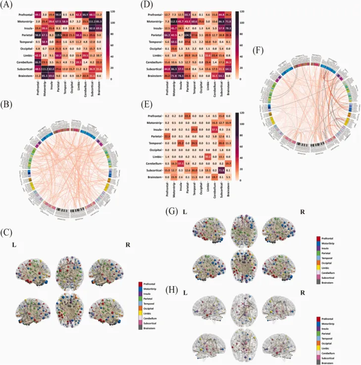 图2. 预测BDI得分变化的预测模型结果。(A.B.C) FC(功能连接)模型中正相关网络的特征权重和脑映射图。(D.E.F.G.H) 多模态模型中正相关网络的特征权重和脑映射图。