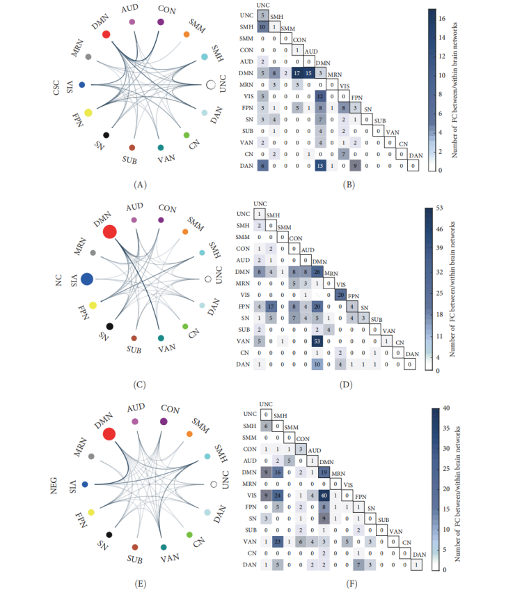 图1. 基于连接组模型(CPM),用于预测CSC(认知自知)、NC(控制思维需求)和NEG(忧虑的负面信念)的显著脑功能连接特征。