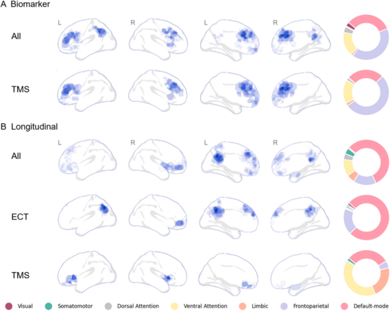 图3. 元分析结果。(A) 所有治疗模式以及经颅磁刺激(TMS)的生物标志物结果。(B) 所有治疗模式、电休克疗法(ECT)以及TMS的纵向效应结果。